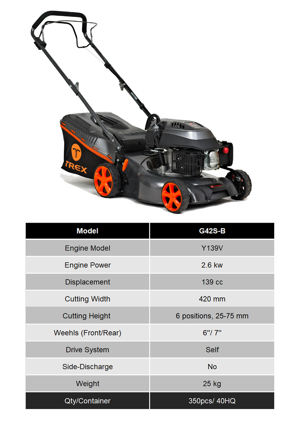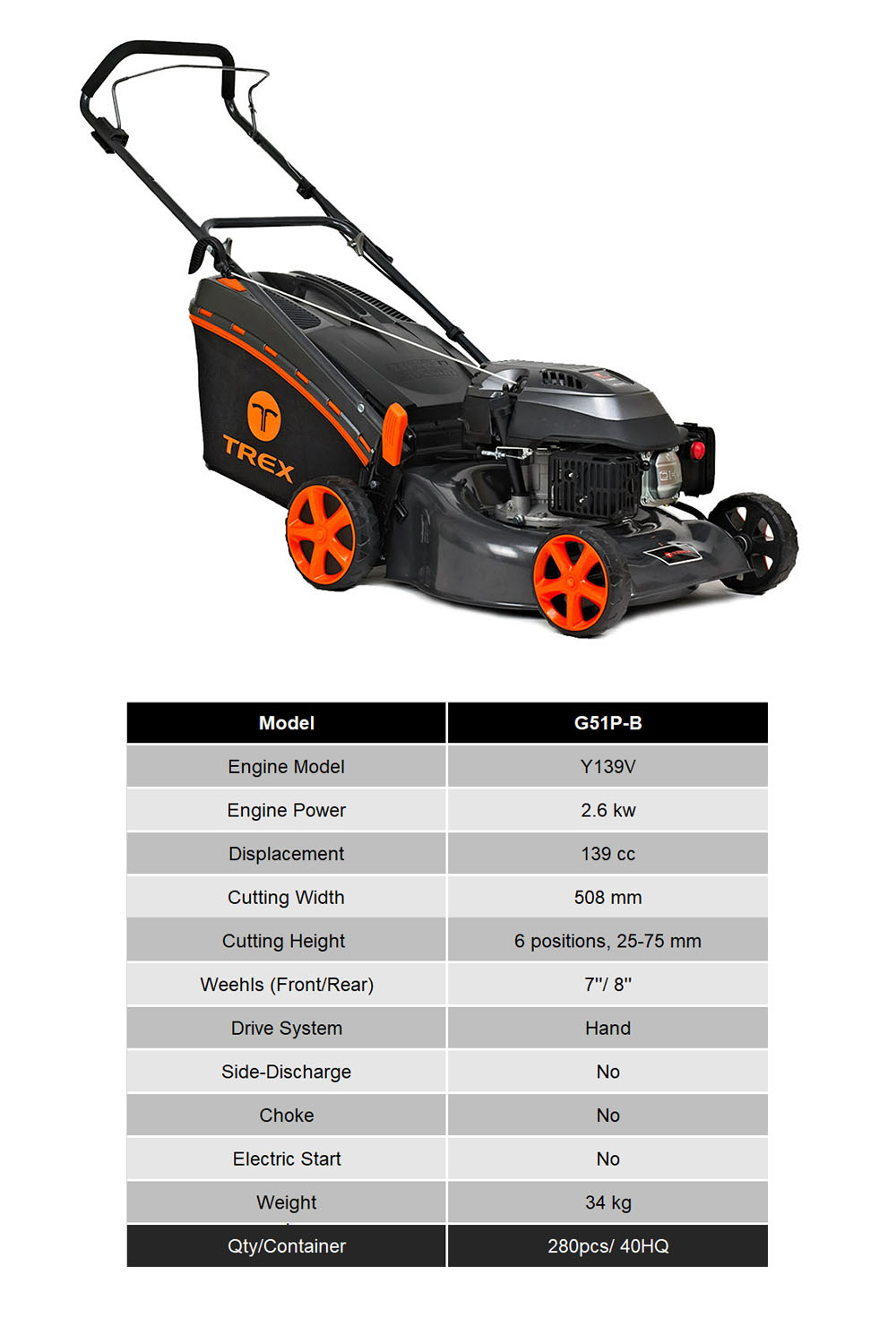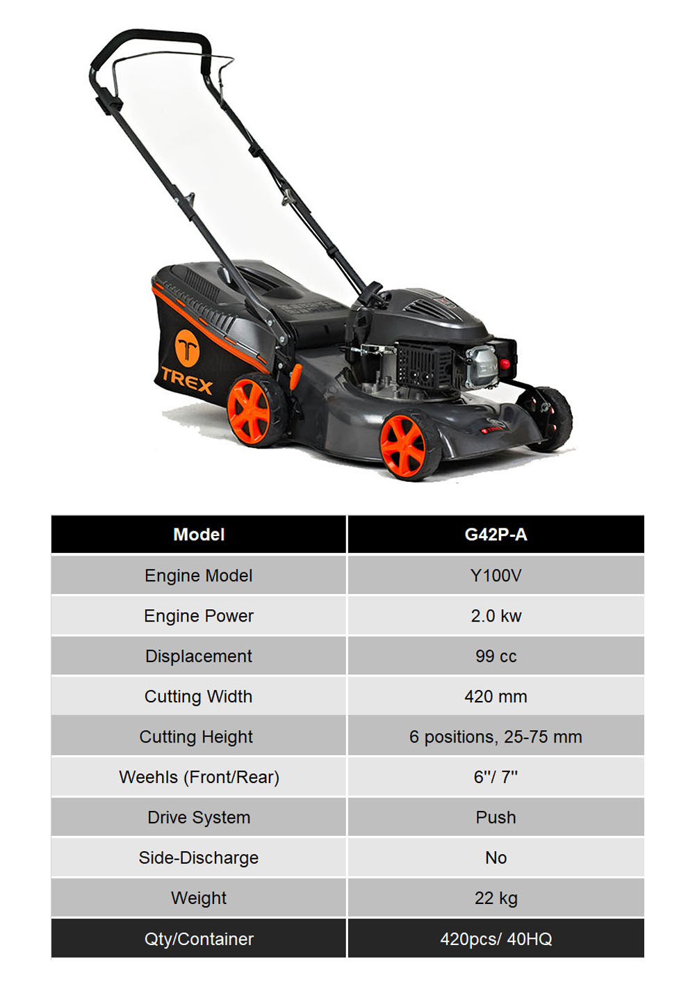 TREX has its own research and development group. The Trex engines have 3 models with different displacement (99cc, 139cc, 173cc). They can satisfy your different power requirement. At the same time TREX engine all use Overhead Valve Technology, which means geater power and lower consumption. The TREX lawn mower with its own engine is popular designed, easy to start, simple to operate with dependable power and has a long lifetime.