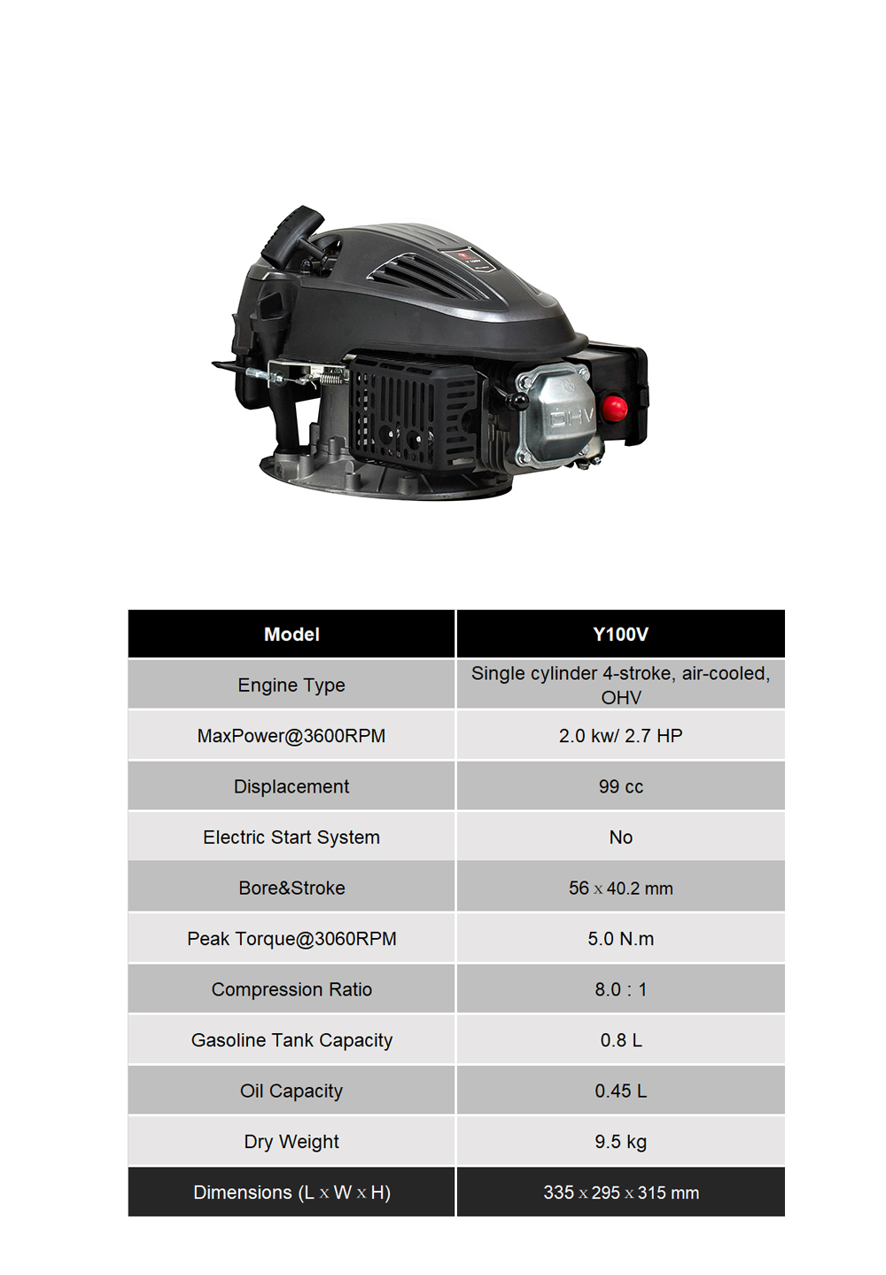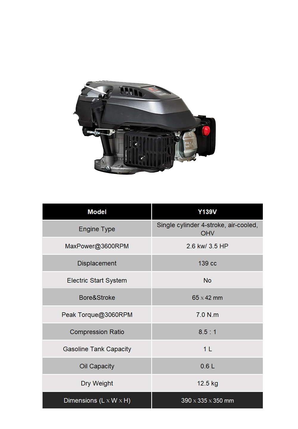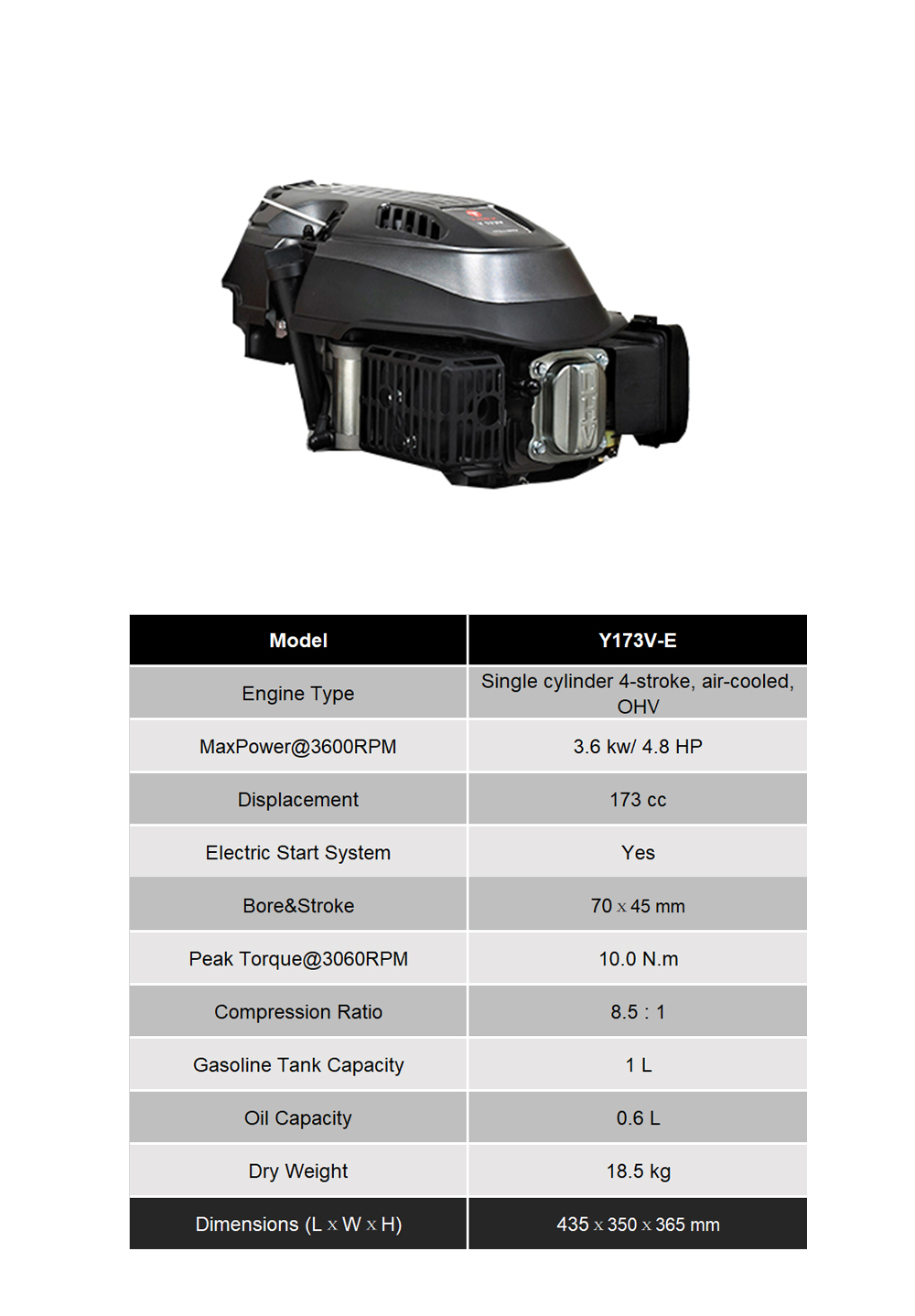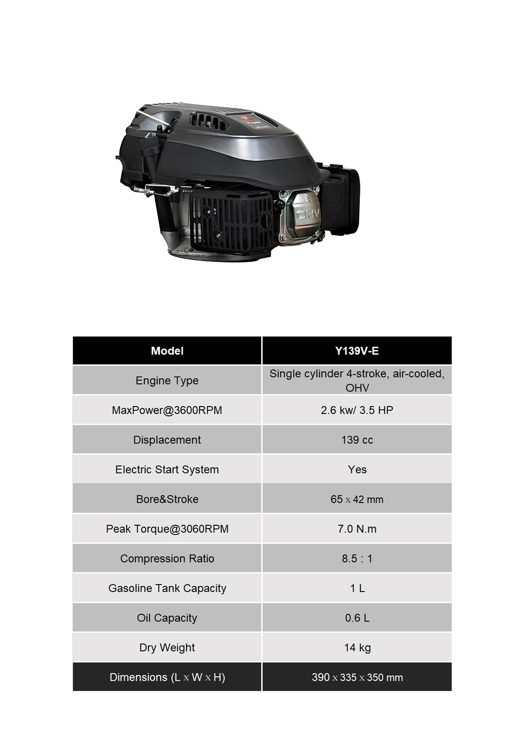 Trex engines have 3 models with different displacement (99cc, 139cc, 173cc). They can satisfy your different power requirement. They all use Overhead Valve Technology. The OHV technology with overhead valves means greater power and lower consumption. Trex engines have compact and popular design. It is easy to star, simple to operate with dependable power and long lifetime.