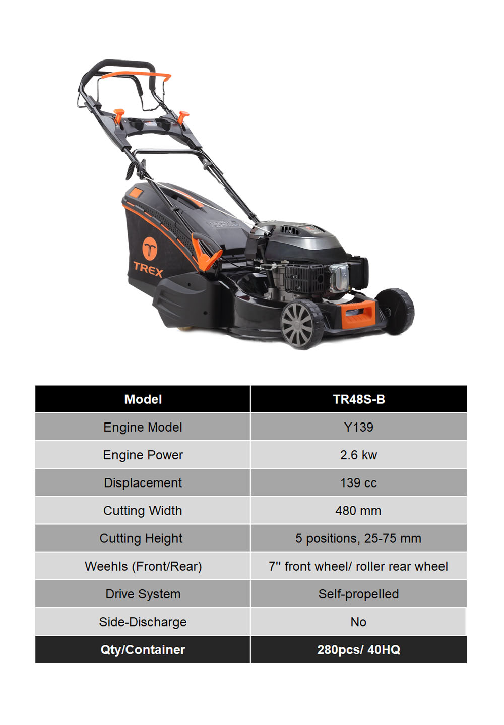 This lawnmower from TREX features a split rear roller for easy turning. It is powered by TREX engine Y139, Y173. Its full width rear roller gives a beautiful stripes finish with a cut as low as 25mm. Self-propelled system gives you convenience while mowing.